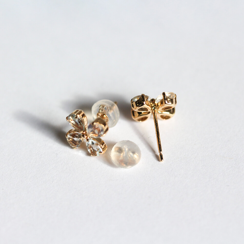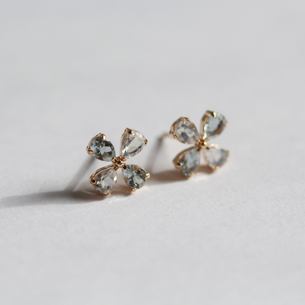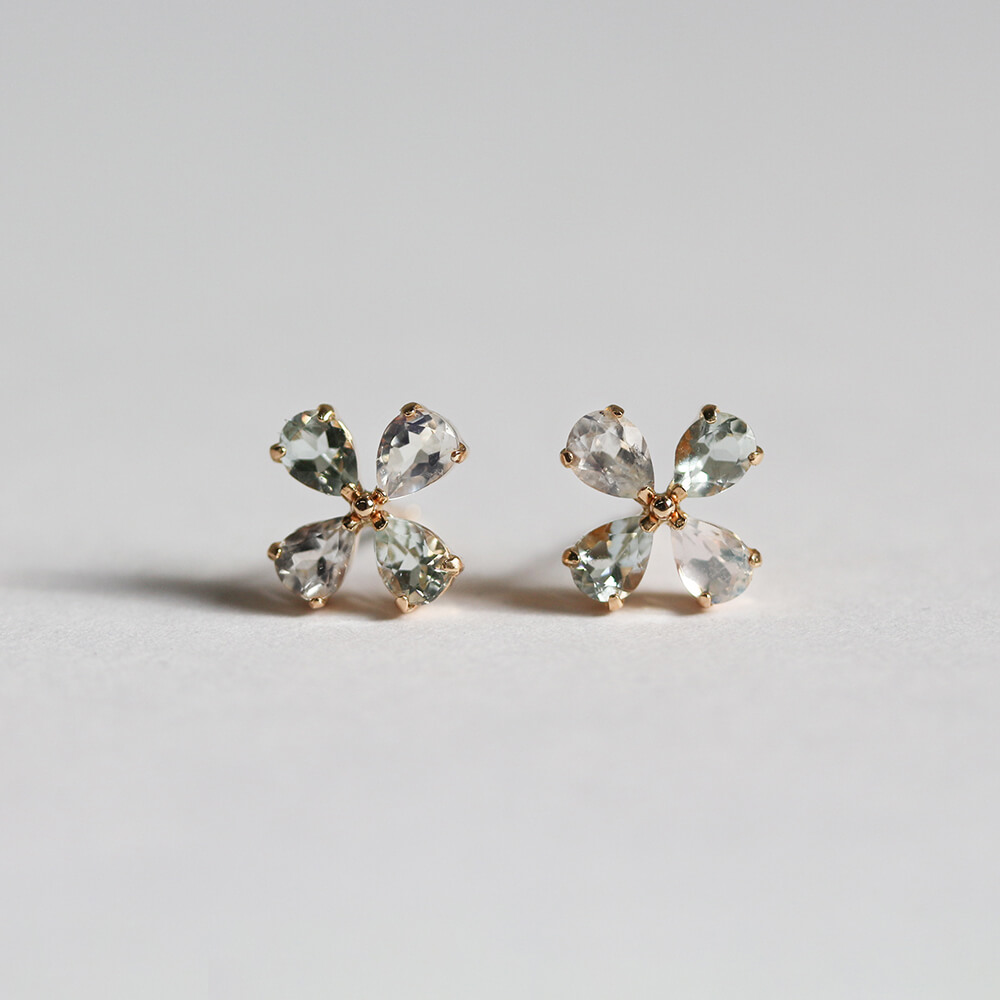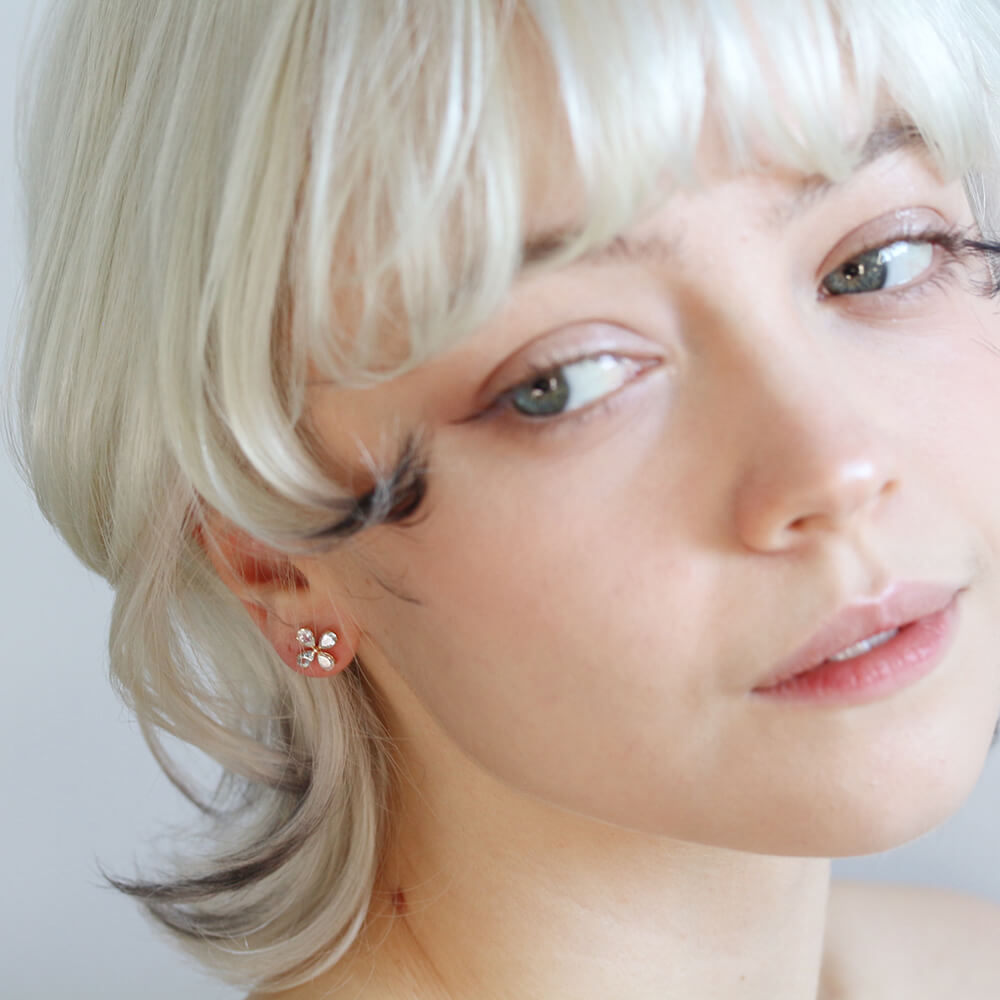耳に乗せたフラワーが明るい輝きを見せ気分を上げてくれるアイテムに。