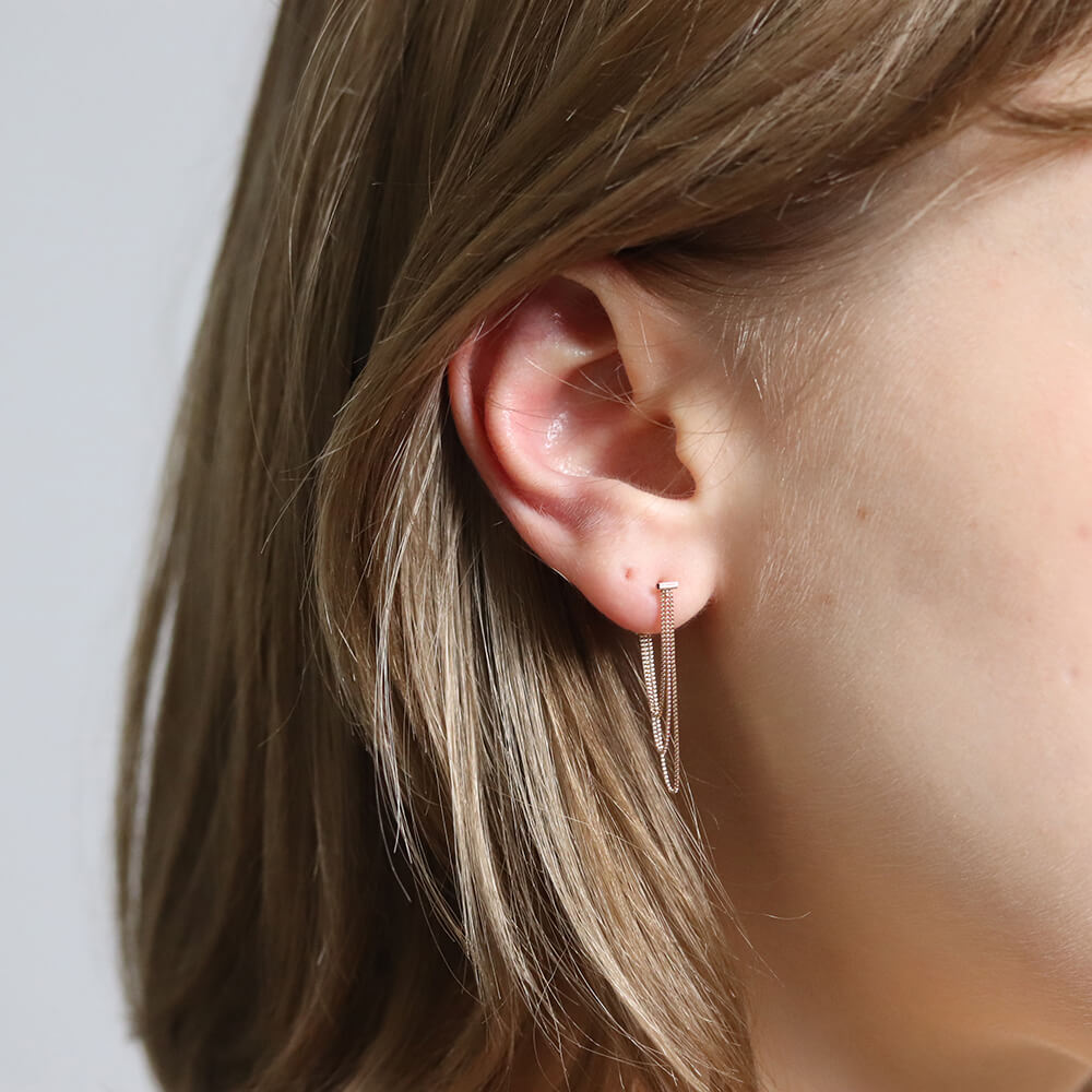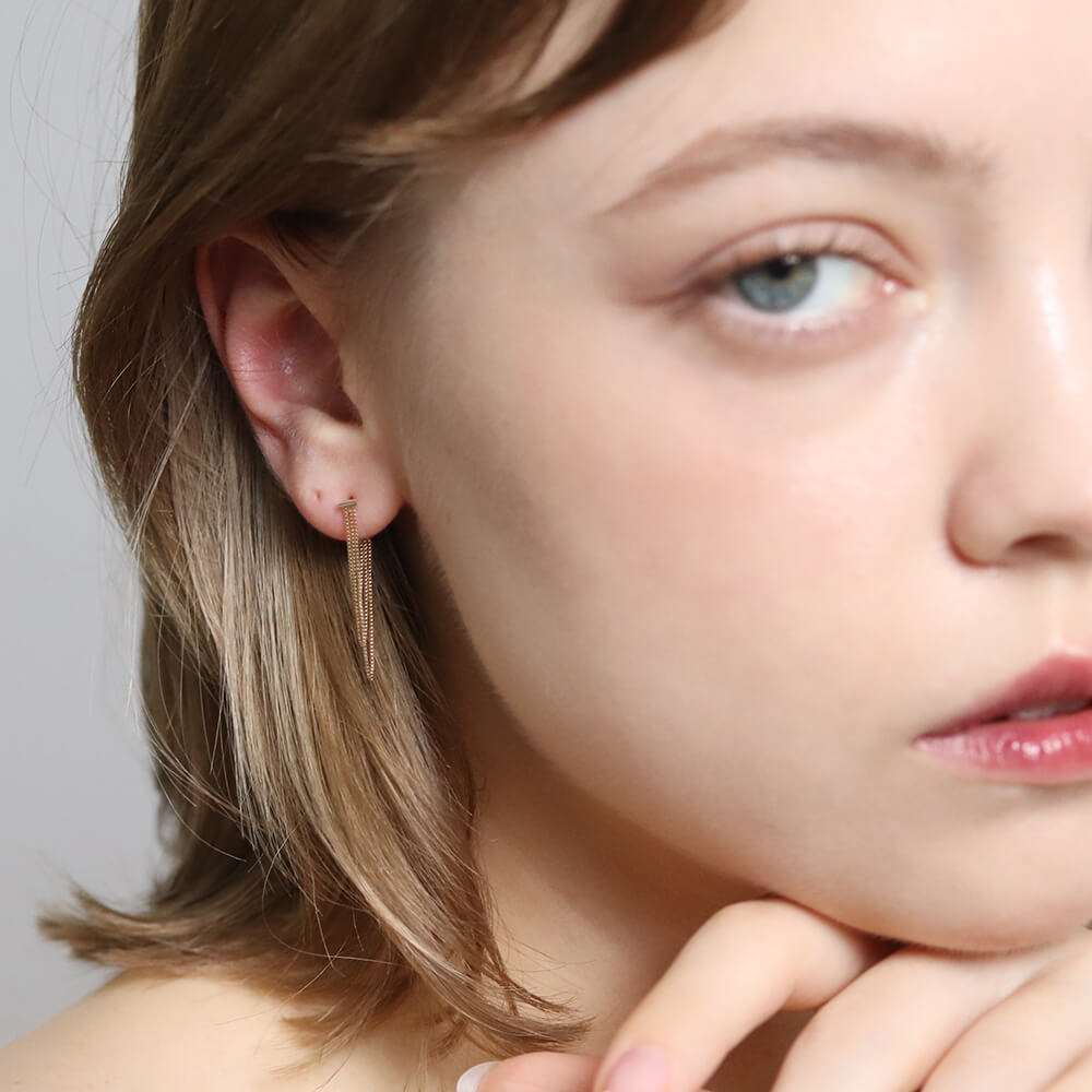 長さの異なる繊細なチェーンは動きに合わせてさりげなく揺れ、光をきれいに反射して耳元を明るく見せてくれます。