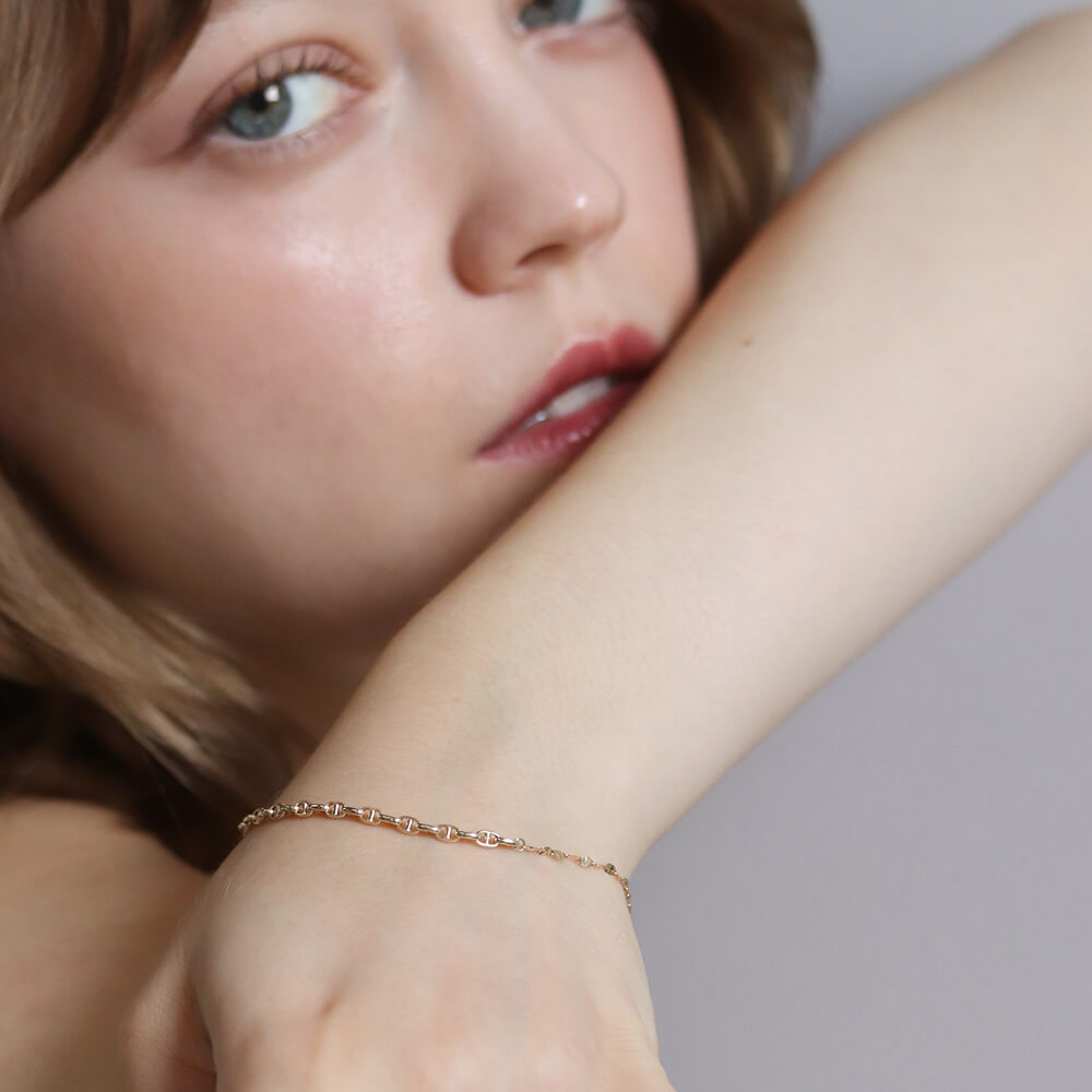 表情の異なる2種類のチェーンを組み合わせた、さりげなく個性が光るブレスレット。