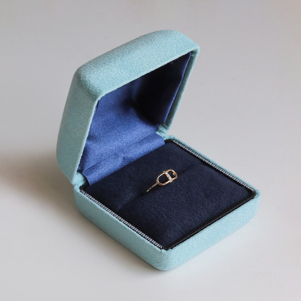 環境保護の観点に基づいた簡易包装です。 ジュエリー破損防止、ピアスキャッチ等の紛失防止のため、ジュエリーをビニール製のチャック付き袋にお入れし、 折りたたみ式の紙BOXでお包みいたします。 又、8,000円(税抜)以下の商品をご購入の場合もこちらの包装となります。 ショッピングバッグ(紙袋)は付属いたしません。