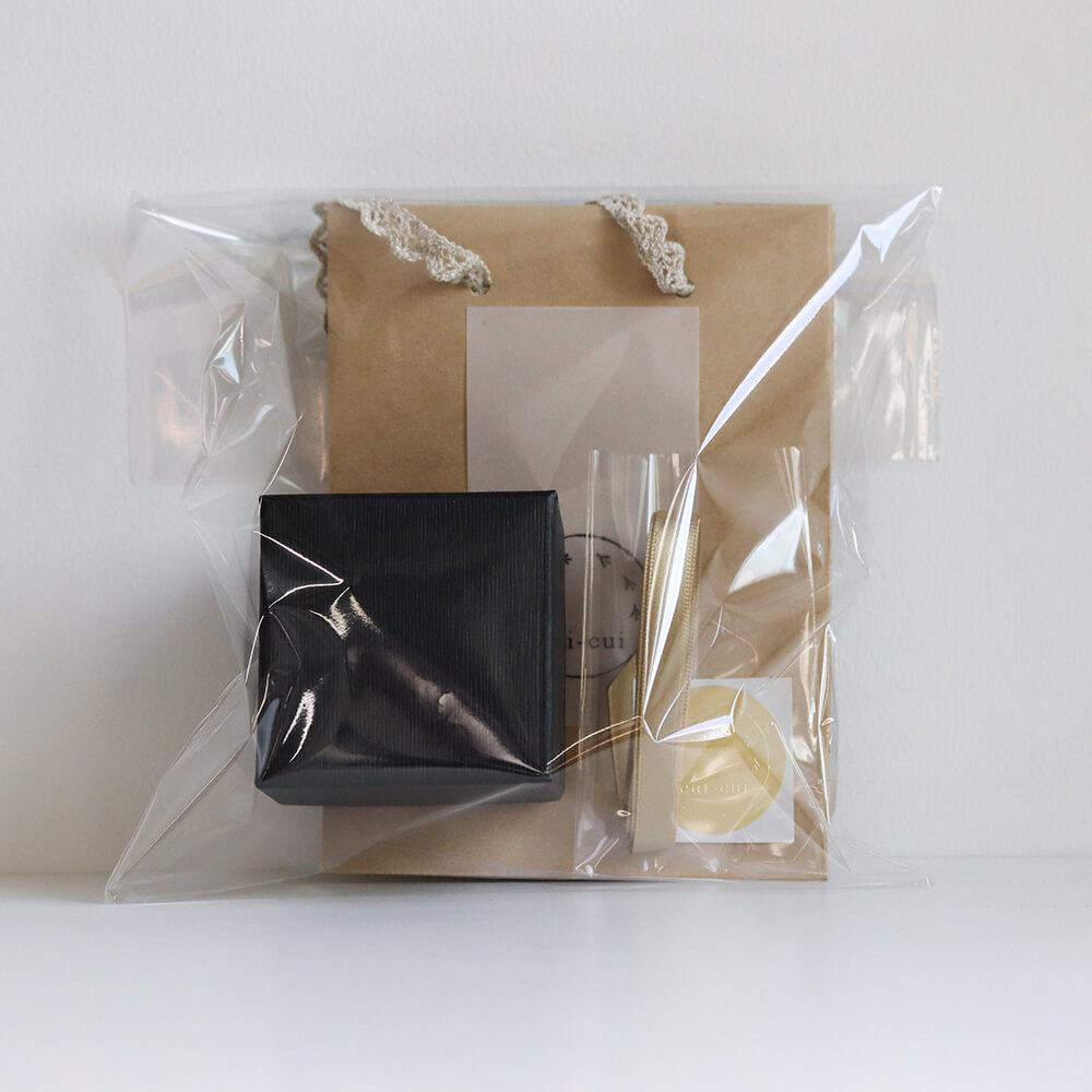 ボックスに合わせたゴールドリボンとcui-cuiオリジナルショッパーが揃っているので、すぐに上品なギフト仕様に。