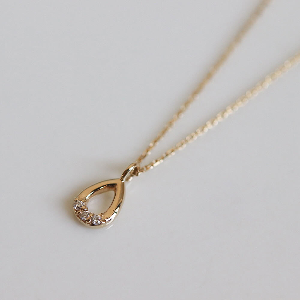 ペアシェイプモチーフに、3石のダイヤがあしらわれたネックレス。