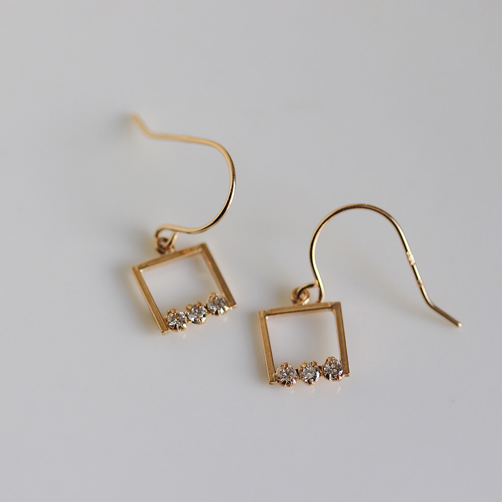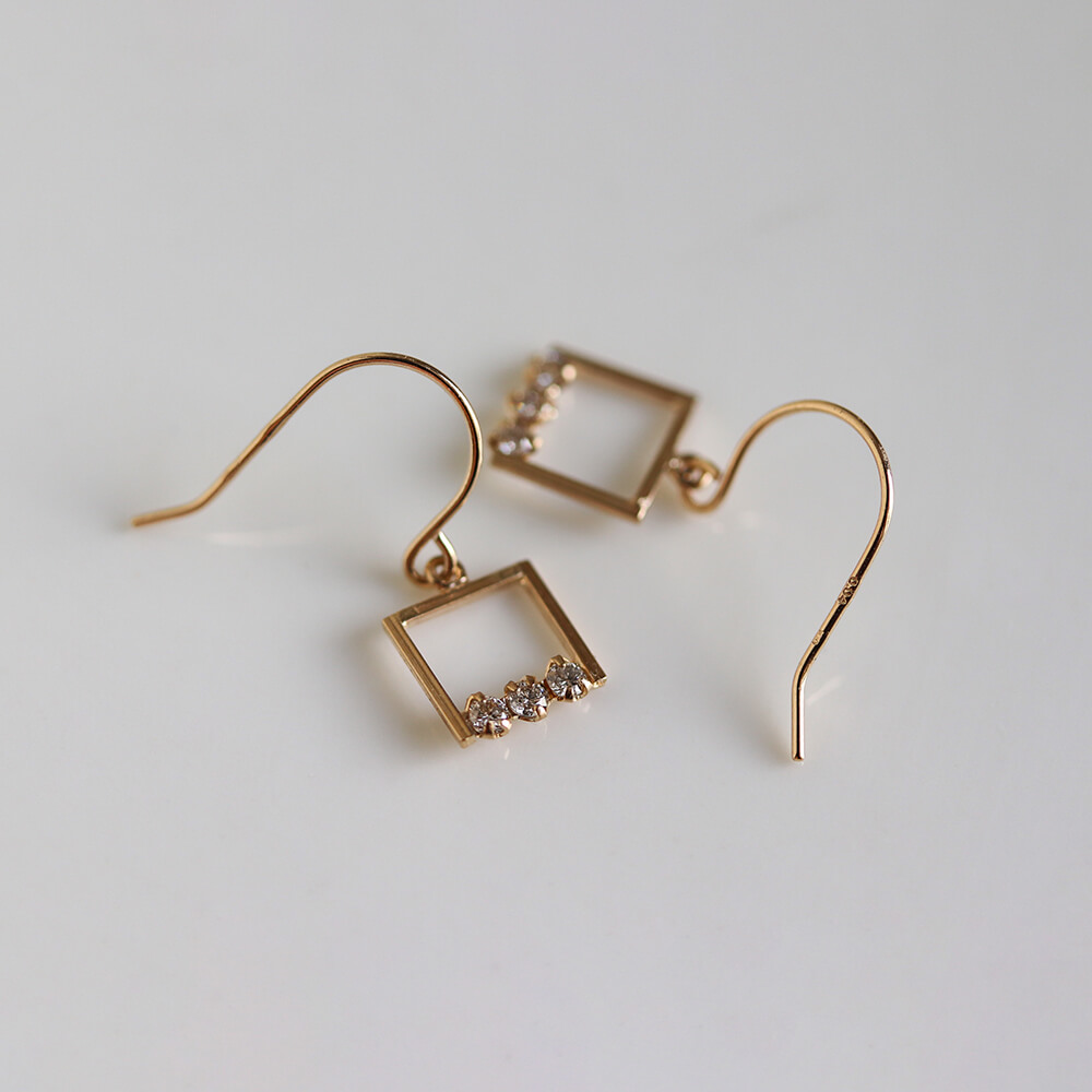 華奢なスクエアラインに3石のダイヤがきらめくフックピアス。