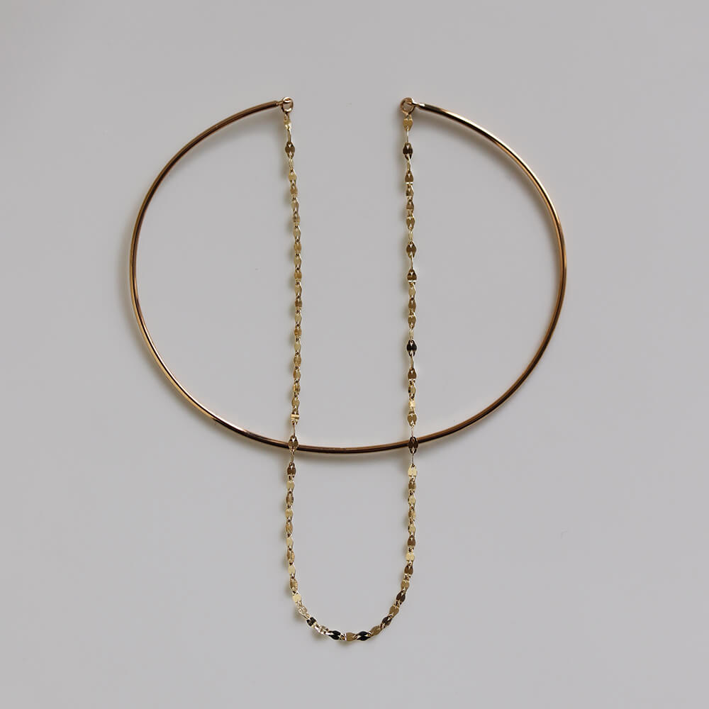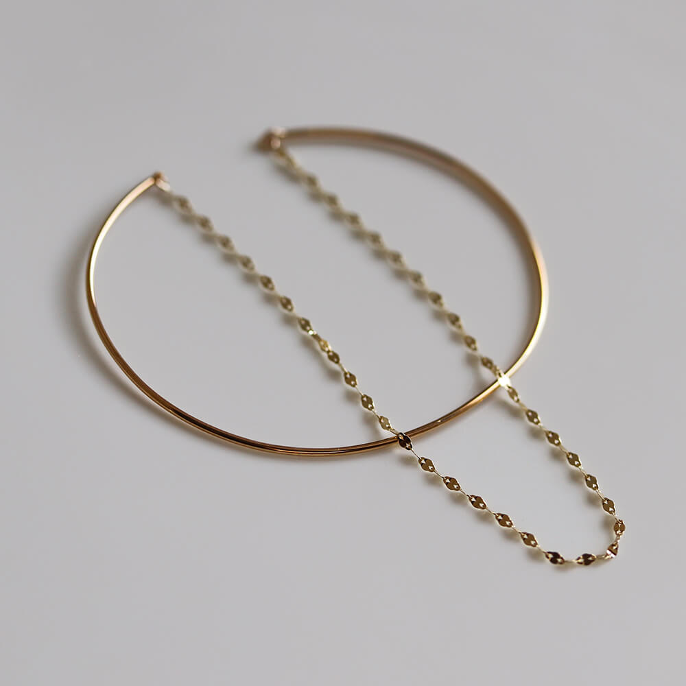 滑らかなラインにエクレアチェーンの煌めきが重なり、動くたびにやわらかな輝きが揺れます。