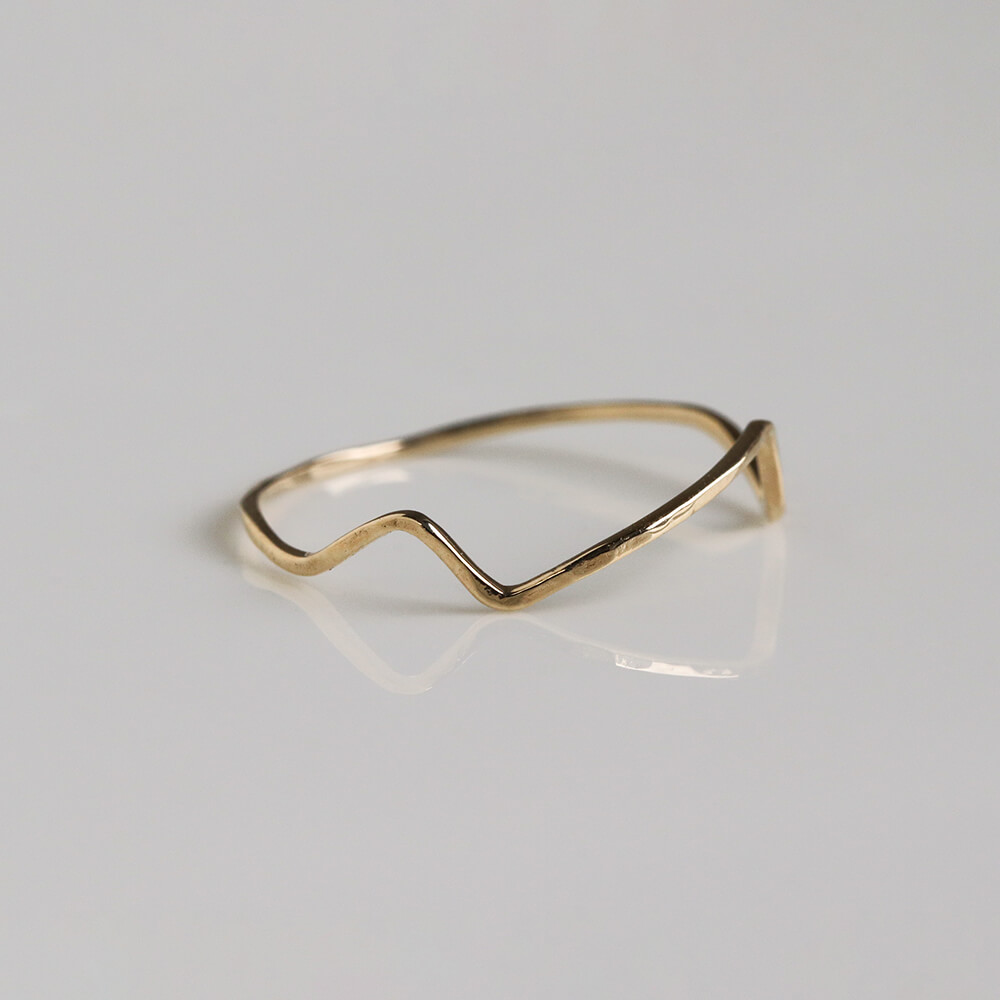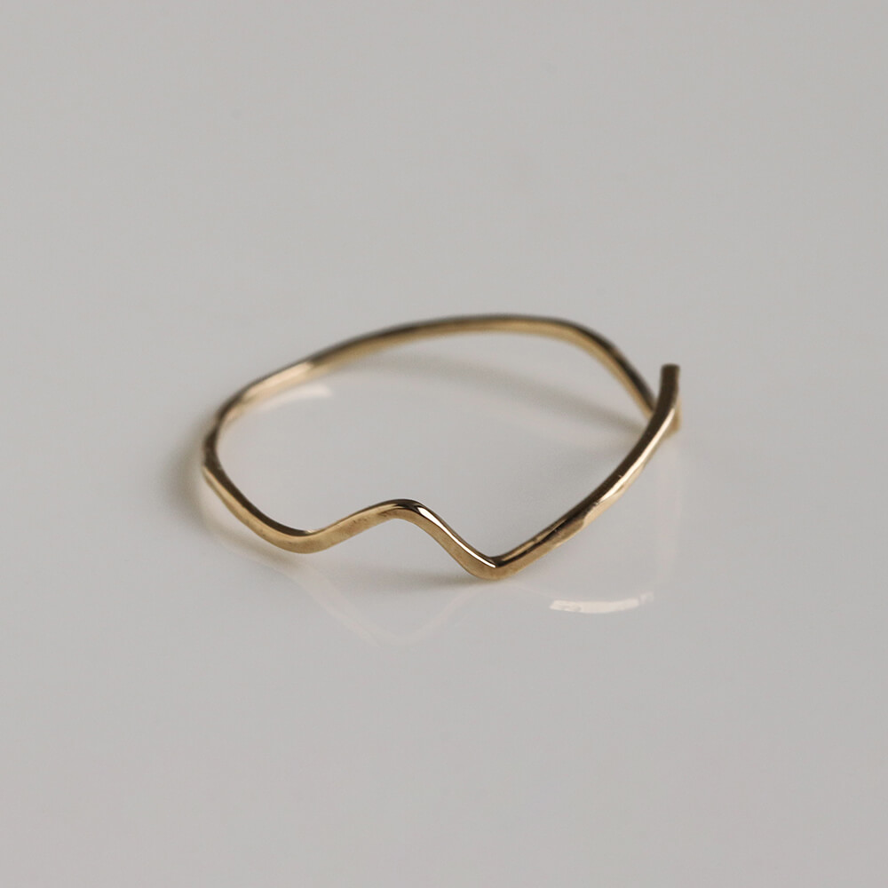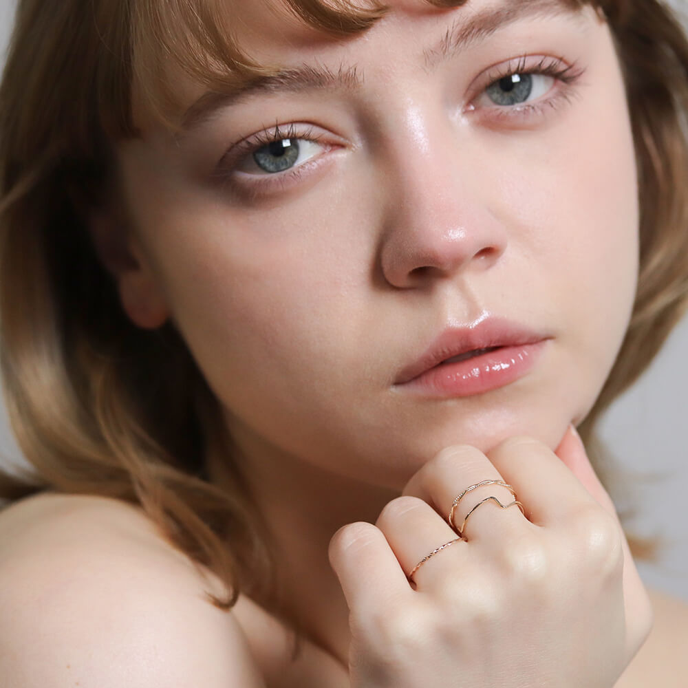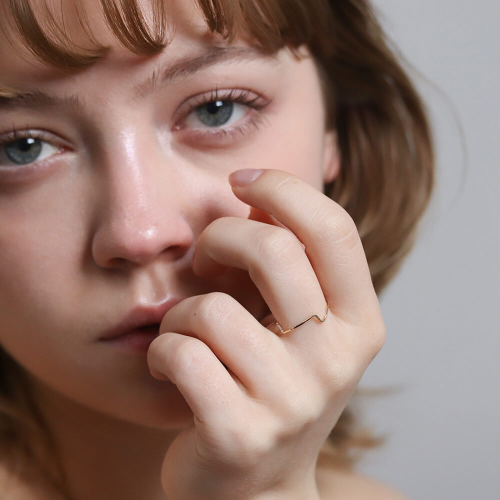 華奢なシルエットで、天然石などボリュームのあるリングとの重ね着けにも取り入れやすい一本です。